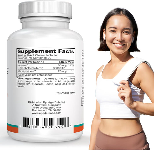 Cherry Flavored Vitamin D3 2000 IU with K2-90 Chewables for Energy & Wellness - Immune Support for Men & Women