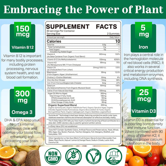 Vegan Multivitamin Gummies with NEVISS Vitamin D3 5000iu & K2 200mcg Gummies - Plant-Based Immune Support