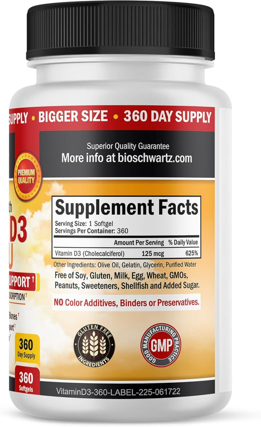 BioSchwartz Vitamin D3 5000 IU Supplement with Olive Oil for Immune Support, Bone Strength, and Muscle Function - 1 Year Supply, 360 SoftgelsVendor:BioSchwartzRegular price $94.36 AUDRegular priceUnit price / per-