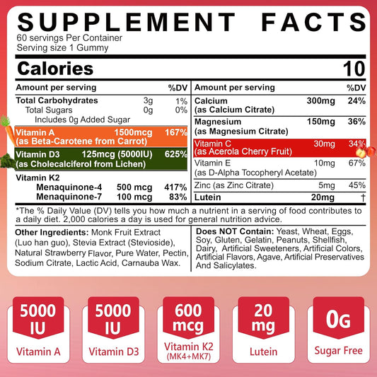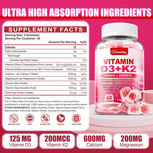 Vitamin D3 K2 Gummies for Adults with Calcium, Magnesium, Zinc, and Vitamin C - Supports Bone, Muscle, and Immune Health - 120 Count
