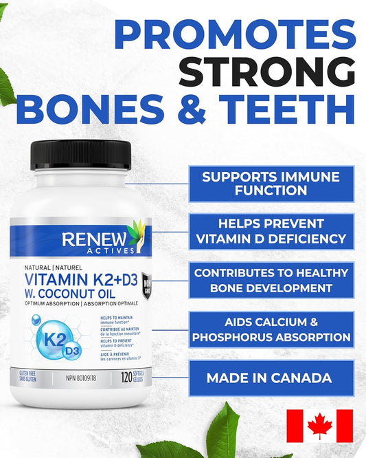 Renew Actives D3 K2 Supplement with Coconut Oil - Supports Immune Function, Bone Health & Calcium Absorption - 120 Softgels