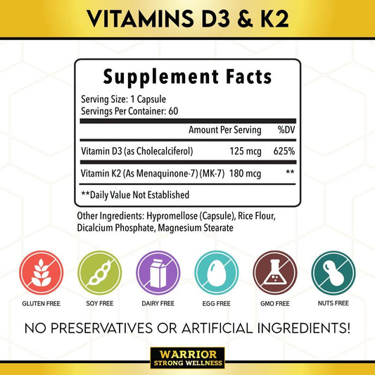Warrior Strong Wellness Vitamin D3 and K2 Supplement - 5000IU Vitamin D3, 180MCG Vitamin K2 - Immune & Heart Support - 60 Veggie Capsules, 2 Month Supply