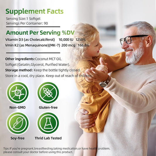 Vitamin D3 K2 Softgels with Coconut Oil - 10000 IU D3 and 200 mcg K2 (MK-7) - Easy to Swallow 2 in 1 Supplement for Calcium Absorption, Immune, and Heart Health - 90 Count