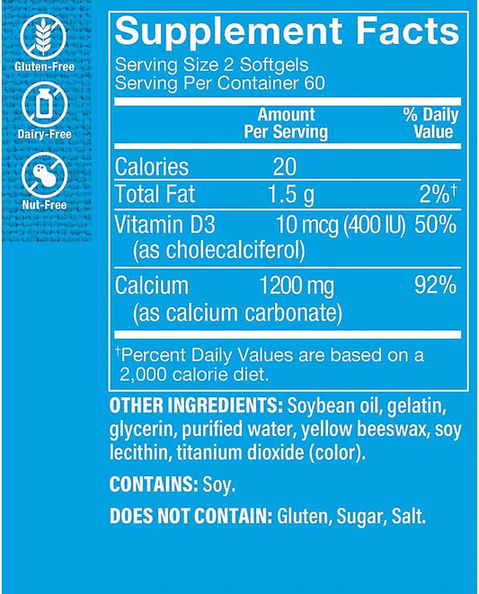1200mg Calcium Carbonate Softgels with 400IU Vitamin D for Bone & Teeth Health - 100% Daily Value - 120 Count