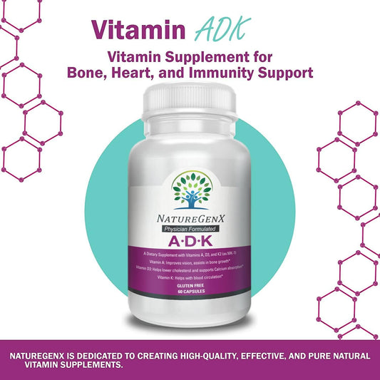 High Potency NatureGenX ADK Vitamin Supplement for Bone Health - 5000 IU Vitamins A, D3, K2 | Gluten-Free, 60 Capsules, 60 Day Supply