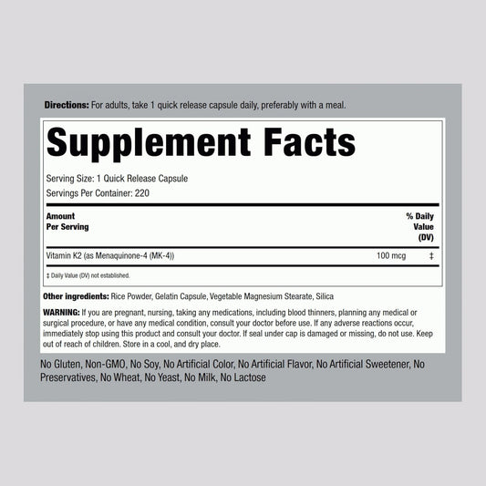 Vitamin K2 MK4 Supplement 100mcg - 220 Capsules - Non GMO & Gluten Free - Piping Rock