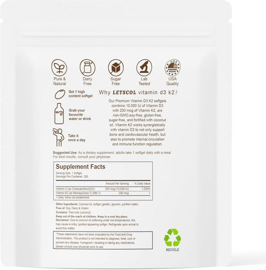 2-in-1 Vitamin D3 K2 Softgel Supplement - 10000 IU D3, 200 mcg K2 MK7 - Immune, Heart, Joint, Teeth, Bone Health Support
