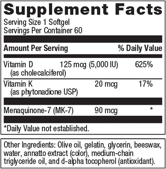 Metagenics Vitamin D3 + K Softgels - Immune, Bone, & Heart Health Support - Non-GMO - Gluten-Free - 60 Count - 5,000 IU