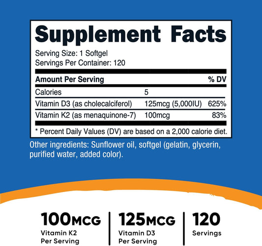 Nutricost Vitamin K2 (MK7) + Vitamin D3 Softgels - 120 Count, 100mcg/5000 IU, Gluten Free & Non-GMO