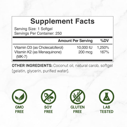 Vitamin D3 + K2 MK7 Softgels with Coconut Oil - 10,000 IU + 200 mcg, Heart & Bone Health Support, 250 Count