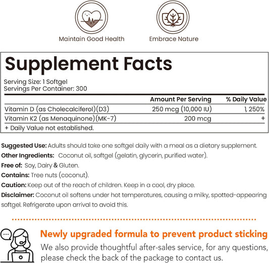 Vitamin D3 with K2 10000 IU Softgels - 300 Virgin Coconut Oil Capsules - Supports Bone Health, Calcium Absorption - Easy to Swallow - 2 in 1 Supplement with MK7 - Packaging May Vary