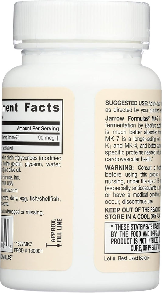 Jarrow Formulas MK-7 90 mcg Softgels - Vitamin K2 for Bone & Cardiovascular Health - Gluten Free Dietary Supplement