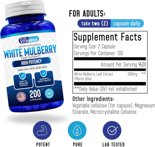 1000mg White Mulberry Leaf Extract Capsules - 200 Vegan Capsules by We Like Vitamins