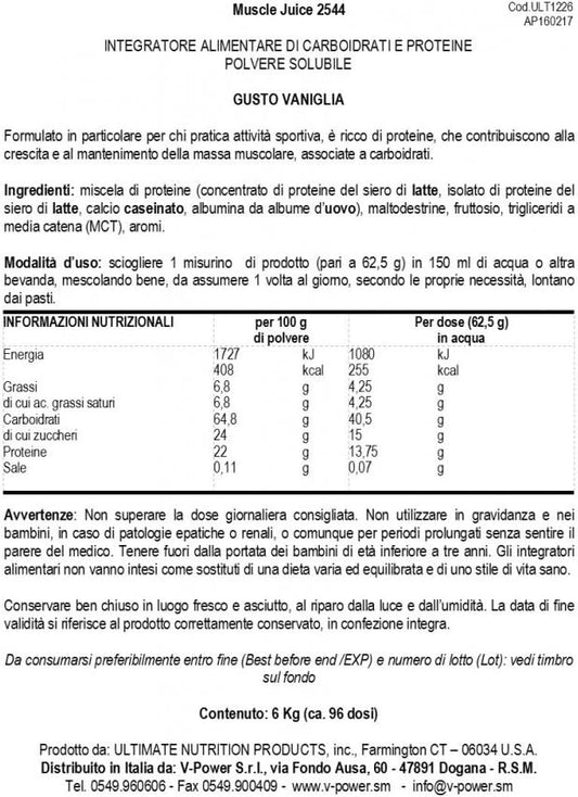 Ultimate Nutrition Muscle Juice 2544 Vanilla Whey Protein Isolate Drink Mix - High Calorie Weight Gain Supplement with 55g Protein - 13.2 lbs