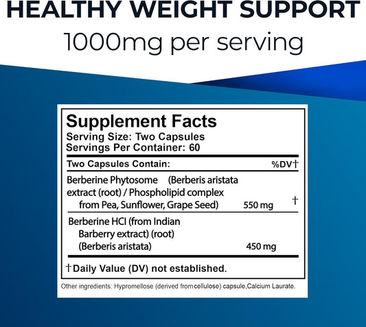 1000mg Berberine HCL Phytosome Supplement for Weight Management & Immune Support - Dual Action Formula for Carbohydrate Metabolism & Cholesterol Health