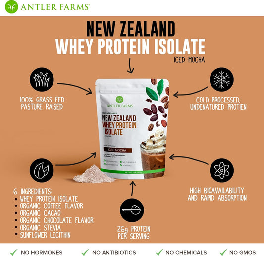 Antler Farms Iced Mocha Grass Fed Whey Protein Isolate - 100% Pure and Clean, 2 lbs, Cold Processed from New Zealand