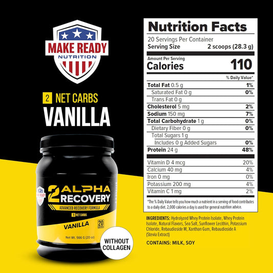 Make Ready Nutrition 2ALPHA Recovery Vanilla Protein Shake - Hydrolyzed Whey Isolate with Essential Nutrients for Shooters - 25g Protein for Muscle Recovery - 566g