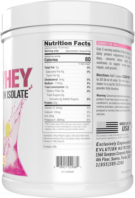 Evlution Nutrition Clear Whey Protein Isolate - Pink Lemonade Flavor - 20g Protein Per Serving - Fast Absorbing Formula for Muscle Growth and Recovery