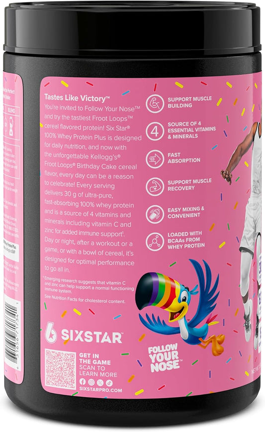Six Star Whey Protein Powder Plus Kellogg’s Froot Loops Birthday Cake Flavor 1.5lb for Muscle Building & Recovery with Immune Support for Men & Women