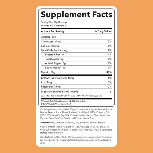 Natural Sweetened Chocolate Peanut Butter Whey Protein Powder, Cold-Processed with 20g Protein - 30 Servings