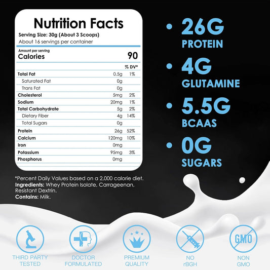 Natural Grass Fed Whey Isolate Protein Powder - 28g Protein, Unflavored, Hormone-Free, Non GMO - 1lb
