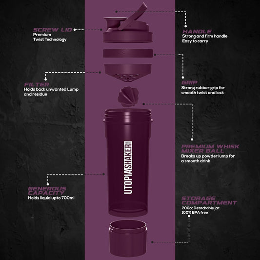 2 Pack 24 oz Plastic Shaker Bottles with Twist & Lock Protein Box - Ideal for Protein Shakes and Cocktails Before & After Workouts - Clear/Plum Color