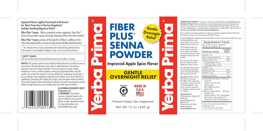 12 oz Yerba Prima Fiber Plus Senna Powder - Apple Spice Flavor, Stevia Sweetened, Gentle Overnight Relief, Restores Regularity
