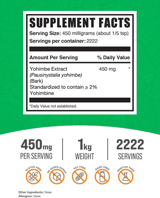 Yohimbe Extract Powder - Herbal Supplement, Gluten Free, 450mg per Serving - 1kg (2.2 lbs) Pack - Bulk Yohimbe Bark Supplements
