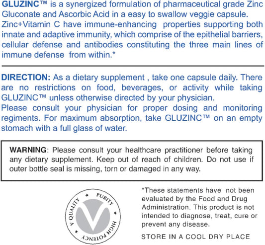 GluzinC Immune Power Combo: 25MG Zinc + 270MG Vitamin C - 60 Vegetarian Capsules