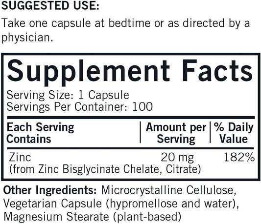 High Absorption Zinc 20mg Capsules for Immune Support - 100 Count - Hypoallergenic Formula by Kirkman