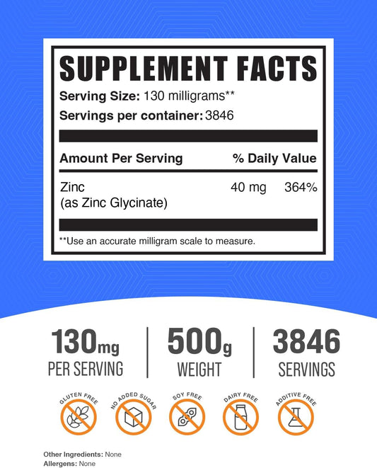 Zinc Glycinate Powder Supplement - 40mg Zinc per Serving, Immune Support, Gluten Free - 500g (1.1 lbs) Pack for Sale