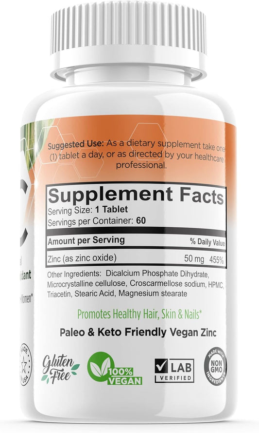 Gentle Zinc Supplements 50 mg for Sensitive Stomachs - 60 Tablets, Vegan & Non-GMO Daily Vitamins for Adults