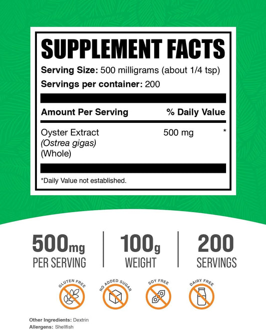 BulkSupplements.com Oyster Extract Powder - Whole Oyster Shell Supplement, Gluten-Free, 500mg per Serving, 100g (3.5 oz) (1 Pack)