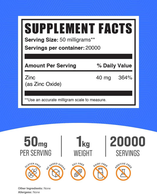 BulkSupplements.com Zinc Oxide Powder - Immune Support Supplement, 40mg Zinc per Serving, Gluten Free, 1kg (2.2 lbs) Pack of 1