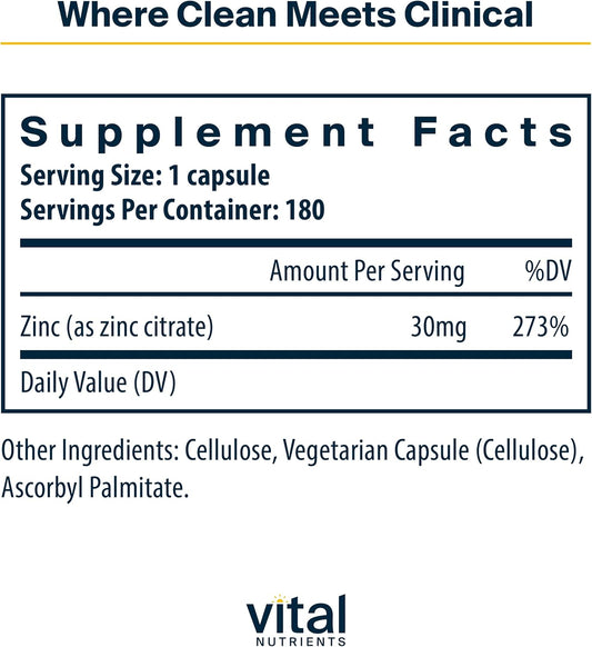 Zinc Citrate 30mg Capsules for Immune Support | Vegan, Non-GMO Zinc Supplement | Easy Absorption Formula | 180 Count